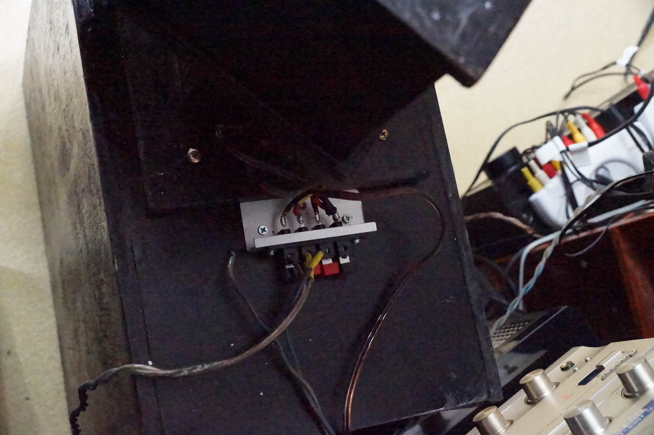 最初の組み合わせでは、この低音部の初めて作るTQWT単体の性能を知りたくてテクニクスのEAS-16F10というフルレンジ・スピーカーを取り付け、モノラルで聴いてみました。このスピーカーもメインの同じテクニクスのフルレンジEAS-10F10と同様、約40年前に購入したビンテージ・スピーカーで、コーン紙からエッジまで変色、一見埃付きのおんぼろスピーカーです。しかし、外見はおんぼろでも、出る音には関係ありません。スピーカーほど見かけによらないものも、他にあまりないでしょう。TQWTに取り付け、とりあえず単体でどう鳴るかを聴いてみまたかったのです 結果は素晴らしいものでした。バックロード・ホーンをやめて、これからはTQWTにしようと思いました。