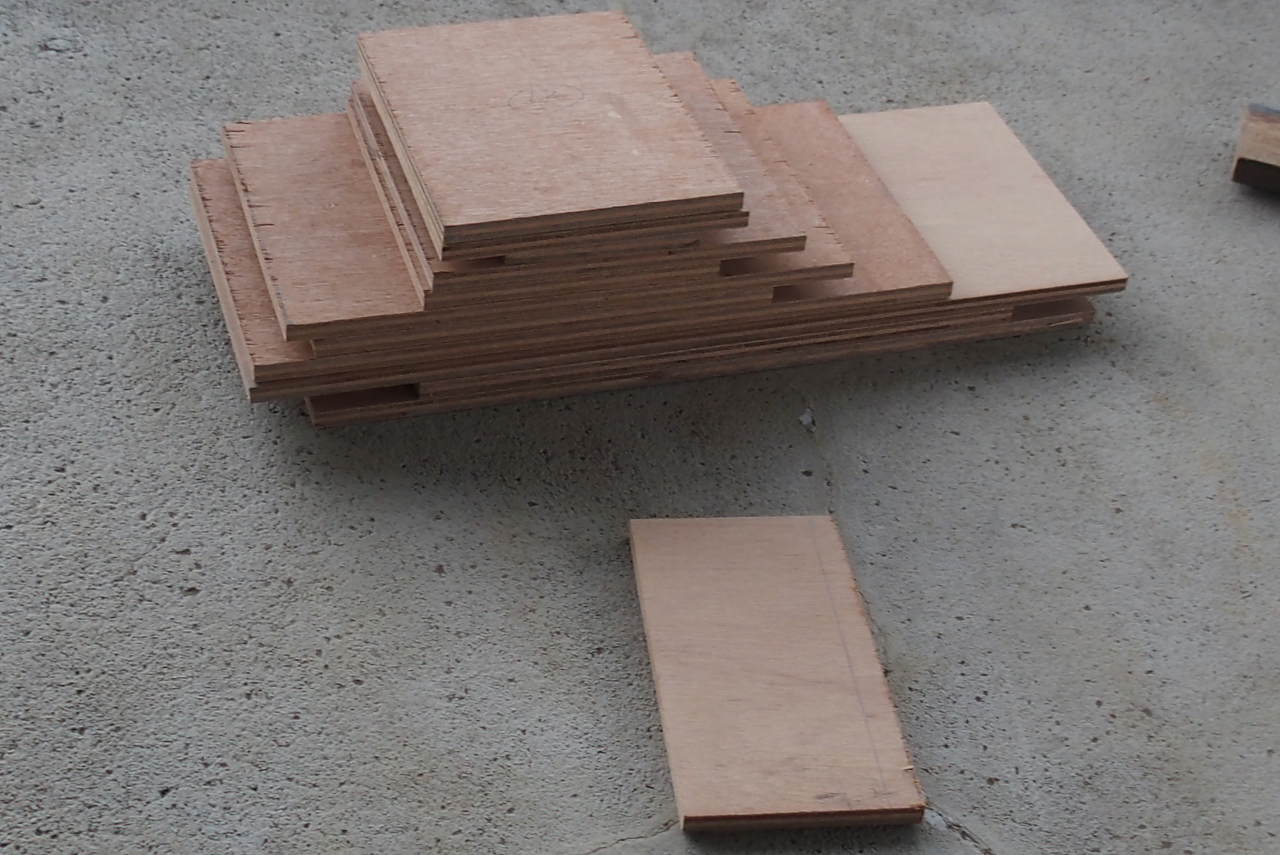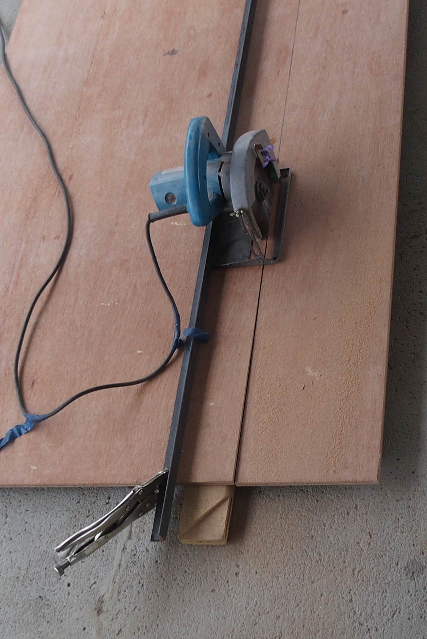 切断作業中。この合板切断は大いに埃が出ますので、屋外でやりますが、この日は雨模様でしたので、屋根があるガレージの上でやりました。いままではコンクリートが打ってある裏庭の通路でやっていたのですが、最近庭の樹木が生長してきましたので、いっそのこと、そこから階段上がって運び上げた方が広いので作業自体は楽でした。これからは、板切りはここでやろうと思いました。