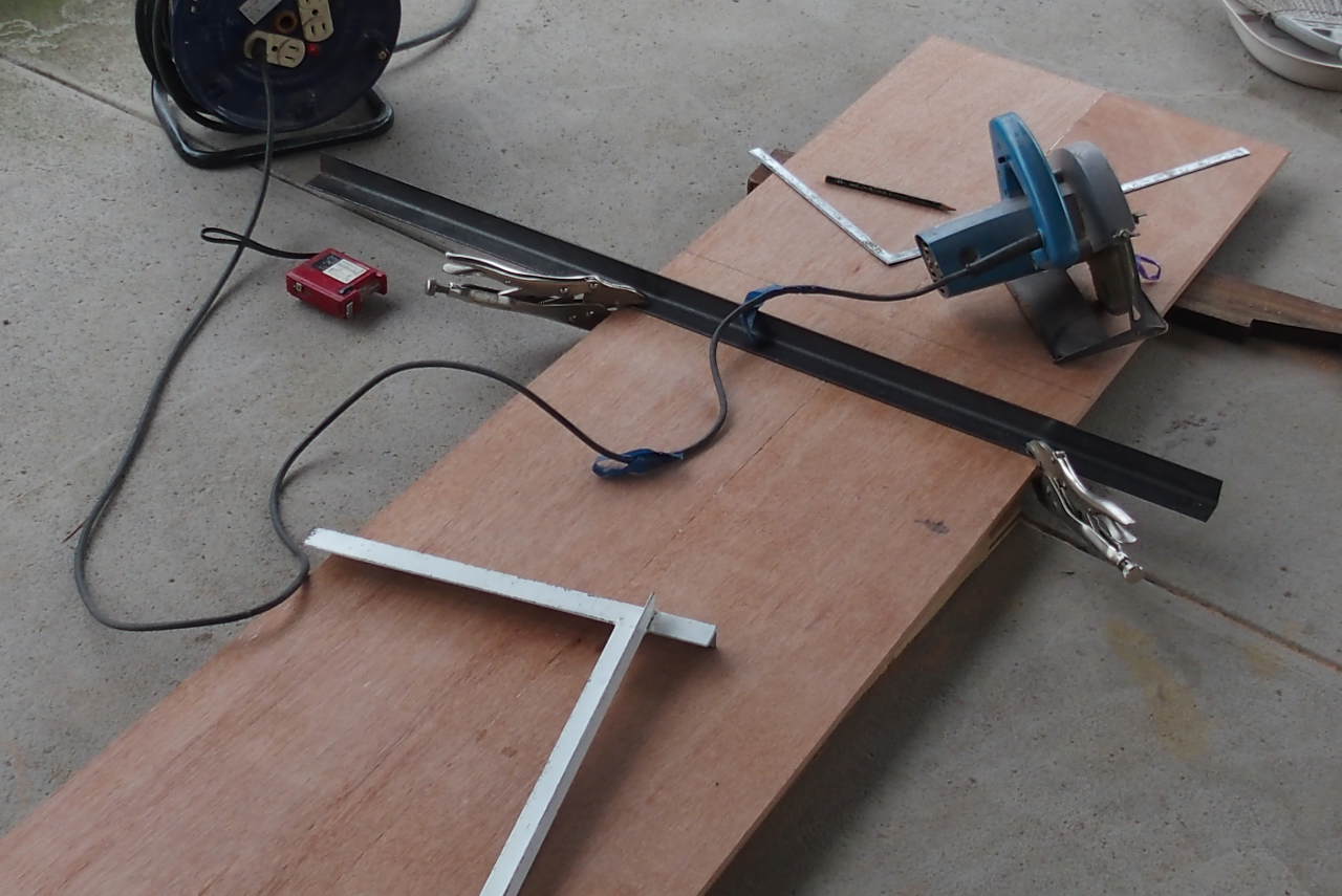 つぎに、ラビリンス(迷路)の仕切り板の切断。これは多少長さは適当でもかまいません。ただし、直角は厳密に。もちろん設計図通りには切りますが。下に見えているのが、もう少し細いものの直角切りをするときの治具(補助具)で、25mmのアングルを溶接して自作したものです。特に、今回は必要ありませんが、角材の切断には威力を発揮します。なかなか直角切りというのは目見当では難しいのです。