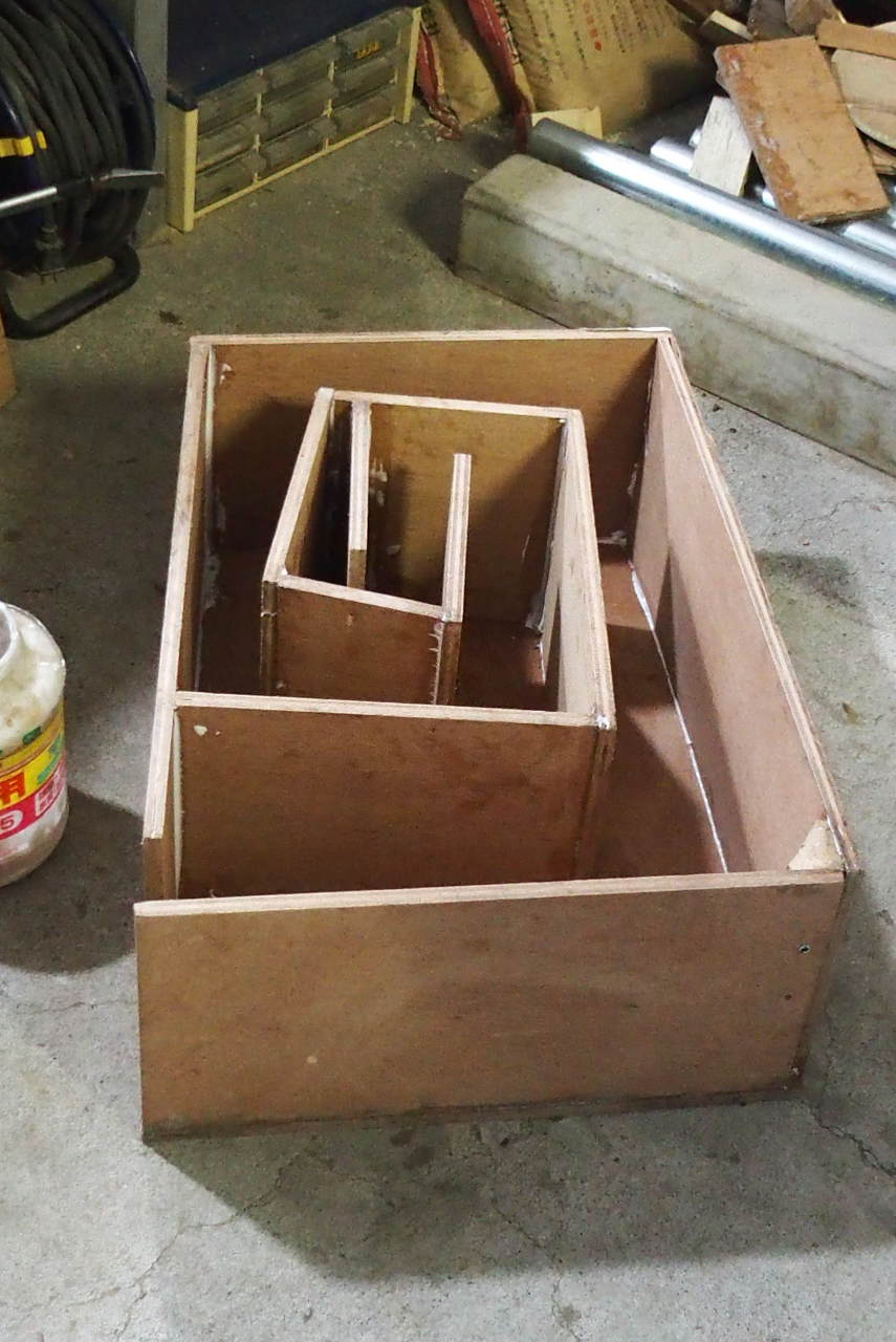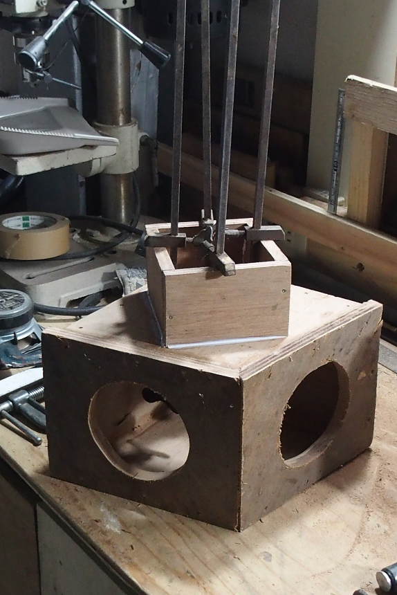 この写真では上になりますが、升のような部分はネックです。低音ボックスに取り付ける時、途中に何もないと、首無し人形のようになって不格好だと思っただけで、特に理論上必要なわけではありません。ただ、あまり長くても、また、ろくろっ首になり、ふたたび不格好でしょう。このぐらいが適当で、この升の途中に穴を開け、スピーカーコードを出すことにしたので、まあ、デザイン的には具合がよろしいかと。