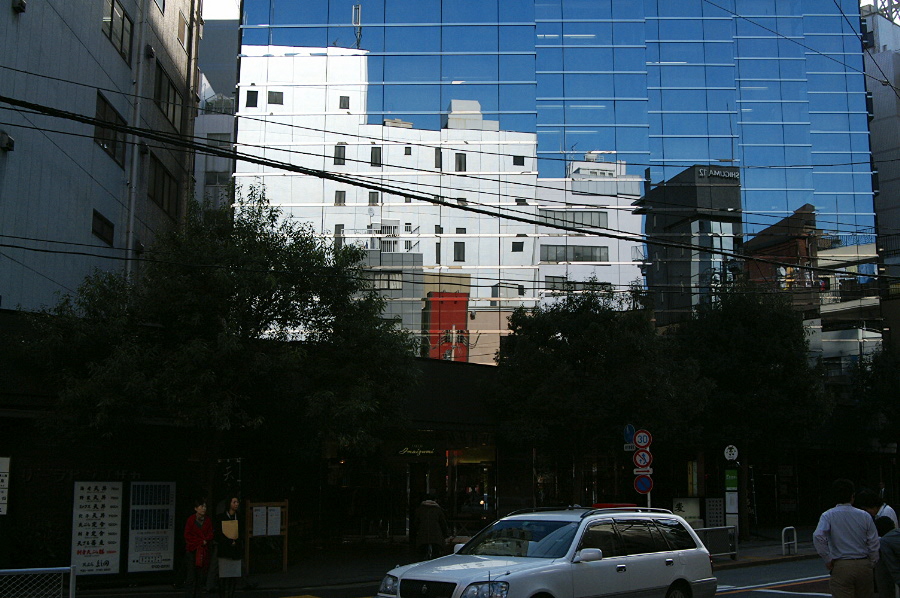 日本の優秀なガラスの平坦性を証明する、鏡面のようなビル・ガラスに写ったビル