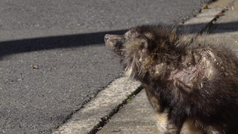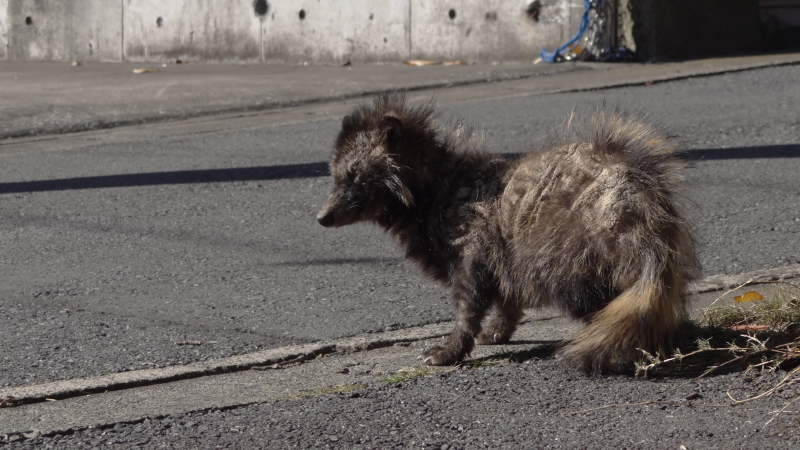 この狸、背中やおしりの毛が抜けて栄養状態悪いですね。可哀想に。